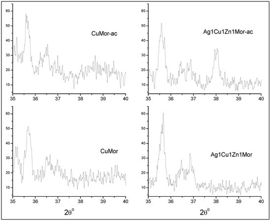 XRD patterns of 35–40° region of the selected samples: CuMor, CuMor-ac, Ag1Cu1Zn1Mor, and Ag1Cu1Zn1Mor-ac.