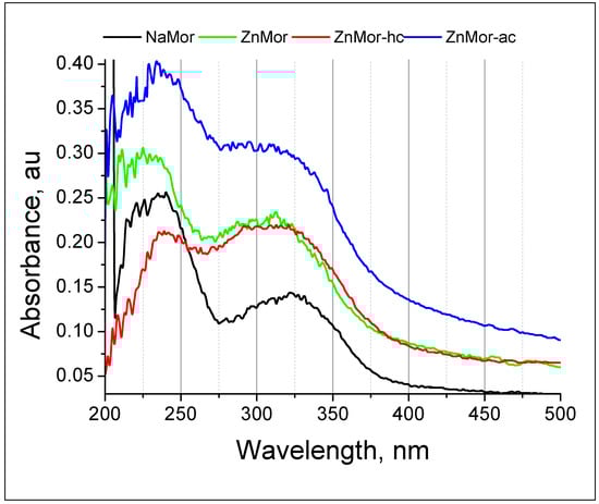 UV-Vis diffuse reflectance spectra of the 200–500 nm region of the selected samples: NaMor, ZnMor, ZnMor-hc and ZnMor-ac.