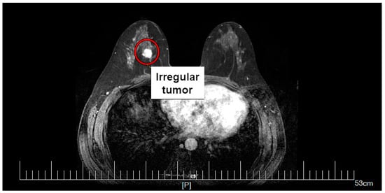 Breast tumors with irregular shapes were analyzed in [], where 22 MRI-based models of breasts with cancers were created. This relatively large repository can be used for the planning, evaluation, and development of treatment, but there are still special cases of breast tumors. In terms of size, location, and tumor depth, the repository covers the majority of breast tumors in the T1, T2, and T3 stages statistically. However, generalized tumor models may be required to ensure the efficiency of treatment strategies for a wider patient population.