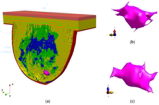 Taking into account the SAR-based heat source and Pennes formulation, the temperature distributions were obtained by applying the Thermal Solver. The following coefficients were assumed: h = 5 W/m2/K, Text = 25 °C, and T0 = Tb = 37 °C [,,], which correspond to the heat transfer coefficient, external temperature, and initial temperature, respectively. The induced steady-state isothermal surfaces for temperatures of 50 °C, 44 °C, and 38 °C (isosurface-50, isosurface-44, isosurface-38) obtained for the differently shaped tumors in the same RF applicator operating conditions (f = 100 kHz) are shown in Figure 7. Isosurace-50 is marked in red, isosurface-44 in pink, and isosurface-38 in blue. In this case, isosurface-50 was considered an ablation zone. Besides, the rendered equivalent tumor models were added.