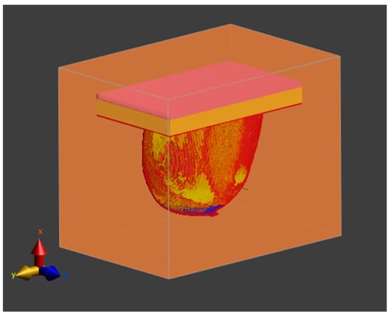 The model represents a class 3 heterogeneously dense (HD) breast containing 51–75% of fibro-connective/glandular tissue []. It corresponds to the breast structure of a 35-year-old female patient. In this study, the breast fat parameters were set for the fatty-1,-2,-3 tissues, the breast gland parameters were set for the fibroconnective/glandular-1,-2,-3 tissues, the fat tissue parameter was set for the transitional tissue, and finally the muscle tissue parameters were set for the tumor. The whole model geometry of the analyzed female breast phantom including the irregular tumor oriented in different planes is shown in Figure 2, with the muscle tissue marked in orange, the glandular tissue in blue, the fatty tissue in yellow, the transitional tissue in green, the skin tissue in red, and the tumor in pink. The tumor was immersed in fatty breast tissue. The dimensions of the modeled tumor ranged from 10.87 mm to 42.59 mm and characterized small and medium tumors in the IA, IB, and IIA stages of breast carcinoma []. The whole model was surrounded by the boundary condition planes with dimensions of 411 mm × 528 mm × 380 mm that represent the background (air layer), as shown in Figure 3.