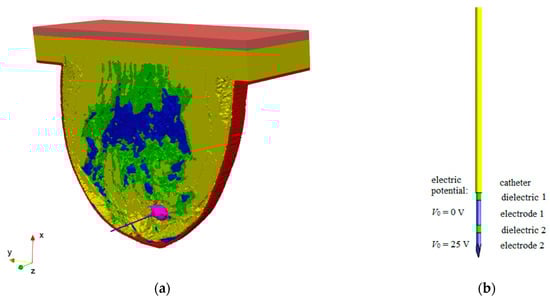 The applicator was inserted in the z-direction into the female breast phantom with the irregularly shaped tumor, as shown in Figure 4a. The electric potential of V0 = 25 V was assumed on the lower electrode (electrode 2), whereas the upper electrode (electrode 1) was grounded (V0 = 0). The upper dielectric (dielectric 1) with a length of 58.5 mm and a diameter of 0.5 mm was surrounded by a plastic catheter measuring 57 mm in length and 0.7 mm in diameter, which served as a protective element.