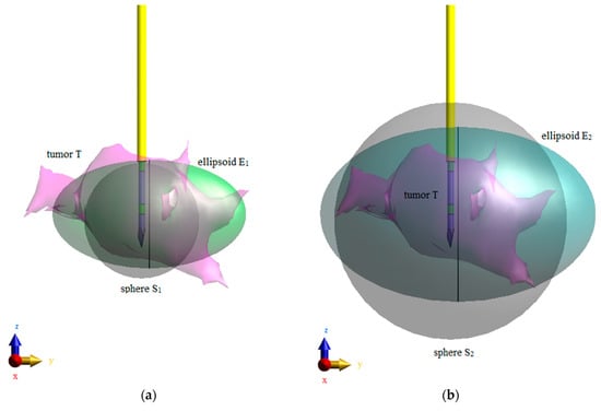 In order to analyze the temperature profiles of tumors with different shapes, two cases of tumor shapes were considered, as shown in Figure 5. In the first scenario, irregularly shaped tumor T was compared to equivalent sphere S1 and equivalent ellipsoid E1, which had the same surfaces and volumes as the tumor (Figure 5a). In the second case, irregular tumor T was replaced with sphere S2 and ellipsoid E2, with correspondingly larger volumes surrounding the tumor (Figure 5b). The geometric parameters and masses of all analyzed tumor models are compiled in Table 2.