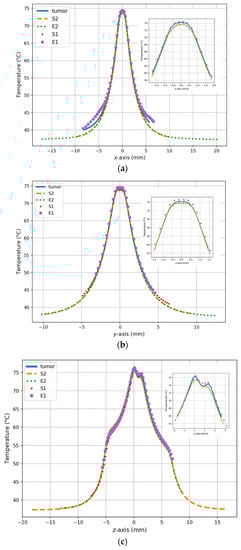 Temperature distributions along different axes of analyzed equivalent tumor models: (a) x-axis; (b) y-axis; (c) z-axis, where S1 and S2 are spherically equivalent tumor models; and E1 and E2 ellipsoidal equivalent tumor models.