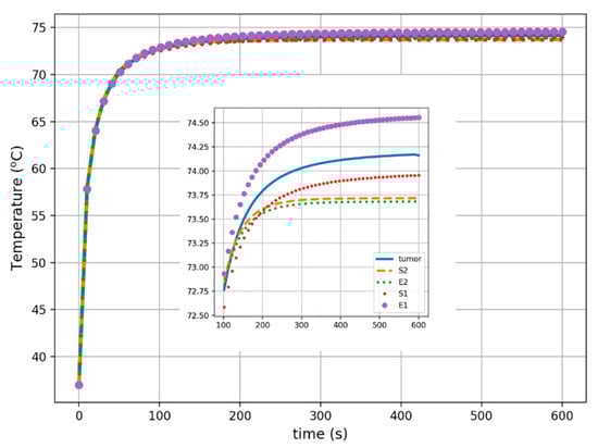 The temporal and spatial analyses were performed to complement the temperature analysis. The temporal thermal analysis showed that the highest temperature inside the tumor, and in the tumor center, was induced in the E1-equivalent tumor model (74.6 °C), and was 0.4 °C higher than the temperature of the naturalistic tumor T. The temperature inside the S1-equivalent tumor model was lower than that of the irregular tumor T, but the difference in the temperature in this case was lower by approximately 0.3 °C. This might suggest that the volume of the equivalent models does not considerably influence the temperature rise.