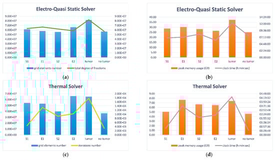 Grid element number, total degree of freedoms, peak memory usage, and clock time values for an electro-quasi-static solver (a,c); and a thermal solver (b,d) in the case of all analyzed tumor models.