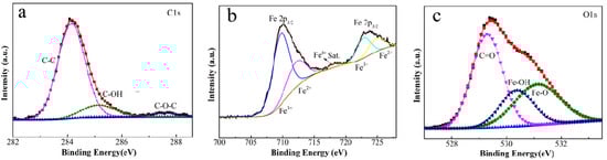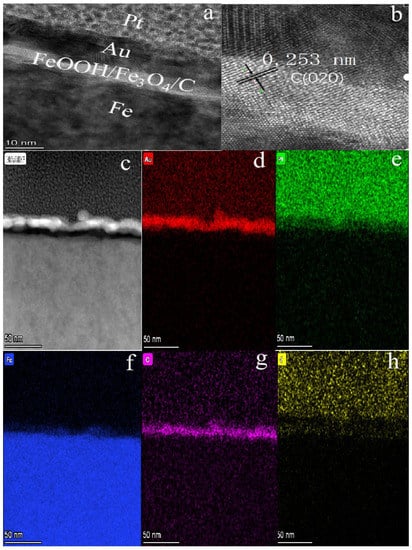 3.1. Characterizations of FeOOH/Fe3O4/C@Fe Composites