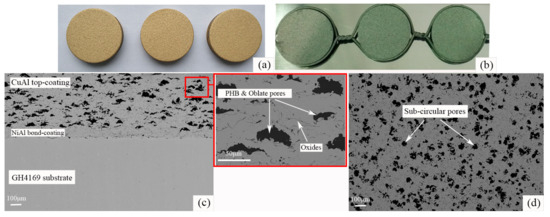 Surface macro morphologies of (a) the CuAl/PHB seal coating and (b) the NiAl coating; SEM images of (c) the cross-sectional microstructure and (d) the surface microstructure of the as-sprayed CuAl/PHB-NiAl abradable seal coating.