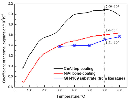 In addition, the intermediate bond-coating (BC) formed by thermal spraying of NiAl alloy powder has fine and dense structure, good uniformity, low oxygen content and porosity. The prepared NiAl BC can improve the bonding performance with the nickel-based superalloy. The coatings were fractured inside the coating after the tensile test, and its cohesive strength was 25~27 MPa, which fully meets the practical application requirements. Figure 2 shows the thermal expansion coefficient of the CuAl coating, the NiAl coating and the GH4169 substrate. The thermophysical properties of the NiAl coating at high temperature (the service temperature was about 600 °C) are between those of the GH4169 substrate [33] and CuAl TC, which can reduce the residual thermal stress inside and at the interface of the coating, to improve the thermal shock resistance and prolong the service life of the coating, further reflecting the importance of the NiAl BC.