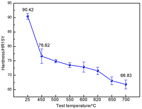 Figure 10 shows the relationship between the thermal stability time at 600 °C and the high temperature hardness of the coating. On the one hand, the oxide content in the coating increases with the increase in thermal stability time, and its hardness gradually increases (as shown in Figure 9). On the other hand, the high temperature can soften the metal matrix of the coating [40]. The higher the test temperature, the lower the coating hardness. Compared with the hardness of the coating at room temperature, the hardness of the coating at high temperature decreased significantly. The hardness of the coating decreased from 30.6 to 16 when the test temperature was 500~700 °C, a reduction of 14.6. The hardness of the coating at 500 °C increased from 30.6 to 44 with the increase in the thermal stability time of 0~100 h, an increase of 13.4. The hardness of the coating at 600 °C increased from 22.2 to 35.1 with the increase in the thermal stability time of 0~100 h, an increase of 12.9. When the test temperature was 700 °C, the high-temperature softening was dominant, and the hardness growth trend slows down significantly due to the high temperature. The hardness of the coating at 700 °C increased from 16 to 23.8 with the increase in the thermal stability time from 0~100 h, an increase of 7.8.