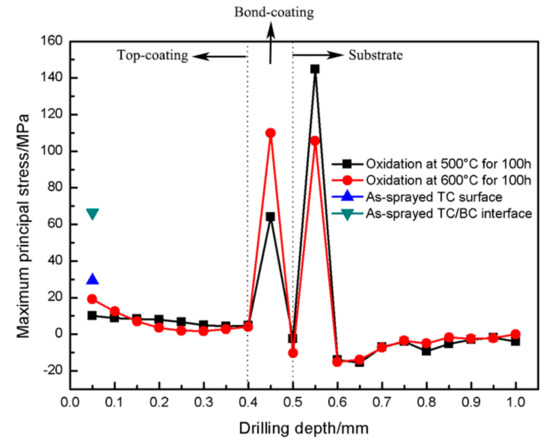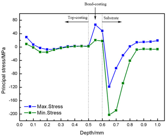 In order to understand the characteristics of the stress distribution in the CuAl seal coating, the stress distribution along the 1 mm thickness direction of the as-sprayed coating surface is shown in Figure 4. It can be seen from the figure that the evolution trend in the maximum and minimum principal stresses of the coating/substrate system along the drilling direction is consistent. The stress magnitudes at the position of drilling of 0.05 mm, 0.5 mm and 0.6 mm represent the stress situation near the TC surface, TC/BC interface and the BC/substrate interface, respectively. The residual stress in the TC basically presented tensile stress when the drilling depth increased from 0.05 mm to 0.5 mm, and the maximum principal stress and minimum principal stress decreased from 29.44 MPa and 8.91 MPa to 2.71 MPa and 2.12 MPa, respectively. When drilling to the BC/substrate interface, the maximum principal stress and minimum principal stress in the 0.1 mm BC decreased from 66.38 MPa and 20.26 MPa to 47.96 MPa and 17.92 MPa, respectively.