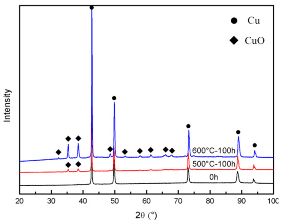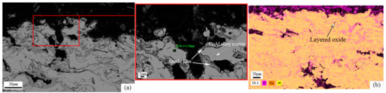 The microstructure and EDS photos of the CuAl seal coating after static oxidation at 500 °C for 100 h are shown in Figure 5. It can be seen from Figure 5a that the gray phase is the matrix and the dark gray phase is the oxide. The oxides are mostly generated around the pores. The thickness of the oxide film around the pores is about 1~2 μm, measured by the image method. XRD test results (as shown in Figure 6) show that the main oxidation product obtained inside the coating was CuO. In addition, according to the EDS results in Figure 5b, it can also be seen that the O element content in the interlayer pores, cracks and other defects inside the coating increased, combined with the further growth of the filiform interlayer oxides of the sprayed coating, resulting in an increase in the content of layered oxides. Therefore, the spraying process has an indirect impact on the oxidation resistance of the coating. Figure 7 shows the microstructure photos of the coating after static insulation at 620 °C, 650 °C and 700 °C for 100 h, respectively. It can be seen from the figure that the Al2O3 film on the coating surface is relatively continuous after oxidation at 620 °C, which helps to inhibit the diffusion of oxygen. However, the oxide film on the coating surface is irregular when the ambient temperature is 650 °C and 700 °C, and an abnormally grown oxide structure appears. The uniformity and density of the oxide film are poor, and it is difficult to prevent oxygen from entering the coating.