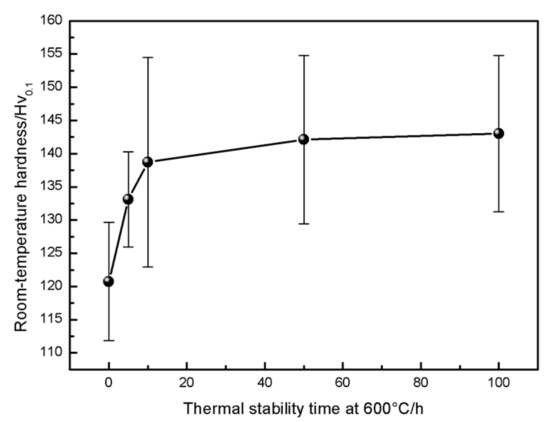 In order to explore the influence of oxidation conditions on the hardness of the metal skeleton phase of the coating, the room and high temperature hardness of the coating were measured using the HV0.1 scale. Figure 9 shows the relationship between the thermal stability time at 600 °C and the room temperature hardness of the coating. The room temperature hardness of the as-sprayed coating (HV0.1, the same as below) was 120.8. The content of hard oxides in the coating gradually increases and segregates with the increase in constant oxidation time from 0~10 h. Therefore, the hardness of the coating increased with the increase in thermal stability time, increasing from 120.8 to 138.7, an increase of 17.9. The hardness of the coating keeps rising with the continuous increase in constant temperature oxidation time from 10~100 h, increasing from 139.7 to 143.02, an increase of 3.32. The increasing rate obviously slows down, which indicates that the coating structure tends to be stable, which is consistent with the trend in the oxidation weight gain experimental results.