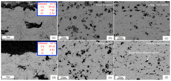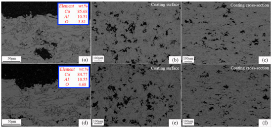 Temperatures of 500 °C and 600 °C were selected to conduct 500 h and 1000 h long-term oxidation experiments based on results in 3.3. Figure 12 shows the images of the microstructures after being kept at a constant oxidation temperature of 500 °C for 500 h and 1000 h, respectively. It can be seen from Figure 12a,d that the content of O in the coating increased with the increase in oxidation time, indicating that the oxide grows further. The coating oxides mainly grow on the coating surface, around the pores and near the defects in the spray particle stack gap. When the oxidation temperature is 500 °C, the oxide film on the coating surface is uniform, with a thickness of about 1~2 μm. The main mechanism of oxidation resistance of the coating is the inhibition of the rapid diffusion of O into the coating by the surface oxide film. It can be seen from Figure 13a,d that when the oxidation temperature was 600 °C, the oxidation resistance of the coating was relatively reduced, and the uniformity of the surface oxide film becomes worse. The content of O corresponding to the coating at the same oxidation time increased, but the increment was not large, with an increase of 51.2% and 17%, respectively. It shows that the CuAl seal coating of this system has good microstructural stability at 600 °C compared with the same type of medium temperature seal coating.