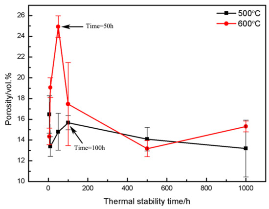 Porosity is an important factor affecting the hardness and abradability of seal coatings. Figure 14 shows the effect of thermal stabilization time on the porosity of the coating at different temperatures. It can be seen from the surface and cross-sectional morphology of the coating in Figure 12 and Figure 13 that the pore shape changes with the increase in thermal stability time due to the further ablation of PHB and the formation of oxides during the heat treatment process. Especially when the thermal stability time is 1000 h, it can be seen from the image of the coating surface in Figure 13e that the pores evolve into irregular shapes, completely different from the sub-circular shape, in contrast with the as-sprayed coating, and the pore size tends to expand outward. It can be seen from the cross-sectional image of the coating in Figure 13f that the pore cross-section becomes more oblate, which is mainly due to the long oxidation time and the further growth of interlayer oxides. It can be seen from Figure 14 that there is an obvious evolution law between the coating porosity and thermal stability time under different oxidation temperatures. A large amount of PHB inside the coating is oxidized and ablated before the oxidation time is 50~100 h, resulting in an upward trend in porosity at this stage, which is consistent with Figure 8. With the further increase in oxidation time, the ablation phenomenon of PHB tends to be stable. Meanwhile, the oxide growth occupies a dominant position, which leads to the negative trend in coating porosity. After the long-term oxidation test, the coating porosity was stable at 15 vol.%. The results show that the CuAl seal coating has good microstructural stability under long-term high temperature service conditions, and it can be predicted that the coating can still maintain good abradability under high temperature conditions.