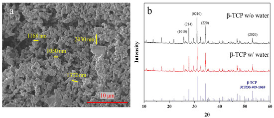 (a) X-ray diffraction analysis result of β-TCP powder (black for origin powder; red for soaked powder) and standard β-TCP peak. (b) Scanning electron microscope image of original β-TCP particles.