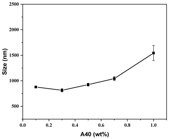 From Figure S2, we observed the difference between β-TCP suspension with and without A40. Although the A40 efficiently suspended β-TCP particles, the particles were still easily suspended. Hence, we adjusted the optimal addition ratio of TCP powder and A40 dispersant to improve the suspension phenomenon. Through dynamic light scattering (DLS), the distribution of the dispersed particles could be observed. From Figure 3, it can be seen that the lowest dispersed particle size was 814.7 nm at 0.3 wt % A40, but the precipitation phenomenon was still intense such that it hardly formed a stable suspension. When A40 exceeded 0.3 wt %, β-TCP had excessive polymers on the surface, which were entangled with each other to cause flocculation and precipitate. It can be seen that the dispersed particle size rose rapidly. When A40 was less than 0.3 wt %, there was too little A40, so the A40 could not completely wrap the β-TCP particles, resulting in the incompletely effective surface modification of the β-TCP surface. The experimental results show that the addition of the dispersant has adverse effects. Too little dispersant (<0.3 wt %) is not enough to coat the β-TCP particles and provide sufficient repelling force, while too much dispersant (>0.3 wt %) makes the long chains of A40 entangled with each other, resulting in aggregation and further precipitation. Hence, 0.3 wt % A40 is chosen for the following steps.