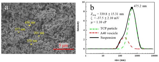 From the above experiments and SEM images, it was inferred that the original particle size of β-TCP was large (>1 μm), and the β-TCP particles could not be effectively dispersed and suspended even after a dispersant was added. Therefore, ball milling was adopted to break the β-TCP particles through the high shearing force and make the particle size smaller to facilitate the subsequent preparation of suspension ink. When using wet grinding, water would flow into the cracks appearing on the particles, which would act as a barrier. After the impact and extrusion of the grinding medium, the cracks gradually enlarge, and finally, the bulk particles are crushed. While the cracks of dry grinding are not filled with substances, and the cracks may be squeezed smaller during the ball milling process, making the ball milling effect worse. If no dispersant is added, the dispersed particles are aggregated into agglomerates under the action of the Van der Waals force, which reduces the impact of ball milling. With the addition of dispersant, the adsorbed A40 surface layer on the particles would repel each other due to the three-dimensional barrier and surface potential, which prevents particles from aggregating again during ball milling. At this time, the impact of the ball milling beads again grind the particles into smaller particles. The dispersant is re-coated, and then the ball-milling beads are re-milled, and so on. Finally, β-TCP particles that are much smaller than the original particles can be milled [32,33]. Hence, the dispersant and water are added before the ball milling process. Figure 4a shows the SEM image of β-TCP after ball milling. It can be found that the β-TCP particles after ball milling are much smaller than those before ball milling.