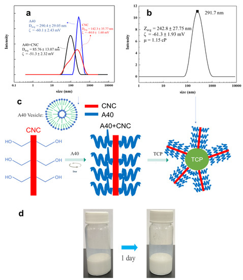 Because the dramatic decrease in dispersed particles, the dissolution phenomenon of A40 and CNC was studied. Using DLS, it could be seen that the dispersed particle size of A40 in water was 290.4 nm, from which it could be determined that 0.3 wt % A40 formed vesicles when dissolved in water, making it less likely to adsorb on TCP particles. Besides the size distribution of dissolved A40, the vesicles can be observed from Figure 4b at approximate 200 nm. The average particle size of CNC in water was 142.3 nm and had a wide particle size distribution with multiple peaks. After we added A40, it became a single peak, and the average particle size was 85.76 nm, which represents a significant decrease. This indicates that, by adding A40, we could increase the steric barriers on the surface of CNC so that the aggregated CNC particles were separated and size was reduced. When the stick-shaped CNC is connected with A40, it should form a long stick connected with multiple A40 dispersants [38,39], as shown in Figure 5c. Finally, the multi-branched sticks were adsorbed to the surface of the TCP, forming stronger steric barriers, so as to more effectively disperse the TCP. In Figure 6, no peaks of A40 and CNC are seen at 90, which means that the multi-branched sticks combined with A40 and CNC were connected to TCP. Therefore, the surface of TCP has a strong stereoscopic barrier and surface potential. The absolute value of the zeta potential needs to be greater than 30 mV to be stable, and the zeta-potential of our suspension reached −61.3 mV, so it could be determined that this liquid is a very stable suspension in terms of surface potential.
