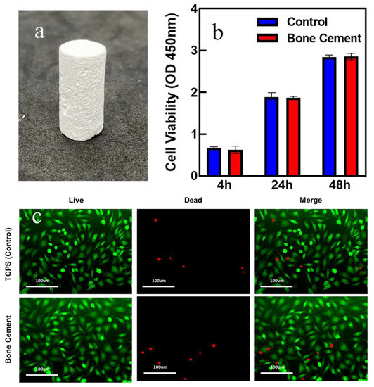 To present the practical applicability of β−TCP ball-milled suspension, β−TCP bone cement was fabricated to present the applications of the β−TCP suspension. Figure 6a shows an example demonstrating the artificial bone cement product. Furthermore, the cytotoxicity was examined to prove that cement does not harm cell cultivation. From Figure 6b, it can be seen that the cell viability of bone cement increased as the time changed and was quite close to that of the control group. To perform the cytotoxicity tests qualitatively, the live/dead assay was also examined. From Figure 6c, after cultivation for 48 h, the majority of the cells on the bone cement were viable with only a few dead cells in the sample, indicating the bio-compatibility of the prepared bone cement. Furthermore, the number of viable cells in the bone cement sample was close to that on the control samples from the images. The above experiments indicated that the bone cement is harmless to cell growth.