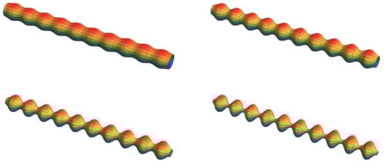 Surface of revolution of a rod with a cosinusoidal corrugations mimicking a chain of spheres connected by necks. In this figure, was set to 0.05 and . From upper left to lower right, varies from 0.2 to 0.4, to 0.6 to 0.8.