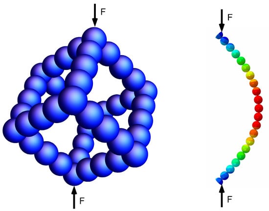 Scheme of a box made with overlapping spheres rotated such that at the top and bottom they can be loaded with a force F. This leads to a bending of the string of pearls at each edge, which is shown in the right figure (a finite element simulation discussed in Section 5). The spherical particles will resist such a deformation and stresses will develop at their necks. The necks act as local stress risers, which can be described by a notch factor.