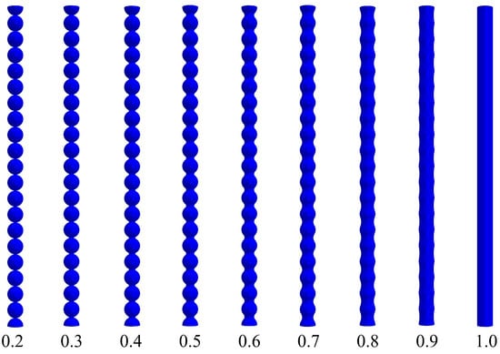 In our previous study [11], a finite element model of pore walls modeled with overlapping spheres representing particles with necks was described. While overlapping spheres appear like particles having necks, these are, strictly speaking, not an accurate description. Particle necks can be more accurately represented by the geometry shown in Figure 5. In this section, we use this approach for computationally designing model pore walls with varying neck sizes (). Figure 6 exhibits these model pore walls with in the reference state. An of 0.2 shows very small necks, while increasing this factor results in wider necks ultimately resulting in a fiber-like array of particles having a constant cross-section. The illustrations shown in Figure 6 give an accurate description of evolving neck sizes in aerogels. These models were generated in ABAQUS and simulated for their buckling behavior using a perturbation analysis. We used a linear elastic model, in which the solid material has a Young’s modulus of 1.5 GPa and a Poisson ratio of 0.3. Solid element type C3D8R was used, which is a general purpose brick element with reduced integration. This element type avoids the phenomena.