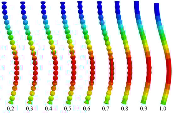 with L the length of the rod, n the number of wave maxima, and , the amplitude of the corrugations. Formally, . We will use later Equation (1) to calculate the bending of corrugated beams and compare the results with a full finite element calculation of a string-of-pearls with necks, see Section 5.