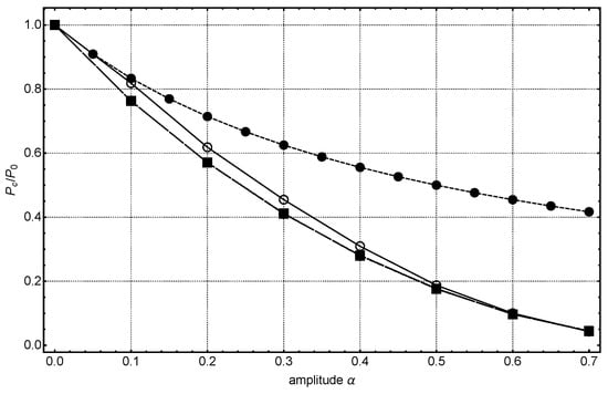 The boundary conditions read . We solve this equation with an implicit Runge–Kutta method using a Mathematica™notebook. In the numerical solution, interestingly, one only gets bending if the value of is above a threshold value. Below this value, the numerical solutions are always close to zero and if the value of is much larger the curve often has more than one extreme. Determining the smallest value of (threshold) for which we get a simple bending curve, should be the smallest possible value of the critical load needed to buckle the beam, given that all other parameters are constants. We always used a value of . At larger values of , beyond 0.7, no stable solution could be obtained. Higher values of do not make sense, because at very small necks the bonding between the particles becomes important and this leads to new effects [21,22]. The full line with open circles in Figure 8 shows the results of the numerical solution of Equation (27) using for the variation of the beam radius expression as given in Equation (1). The relative buckling load, decreases with the amplitude of the corrugations . is the critical load of the -case.