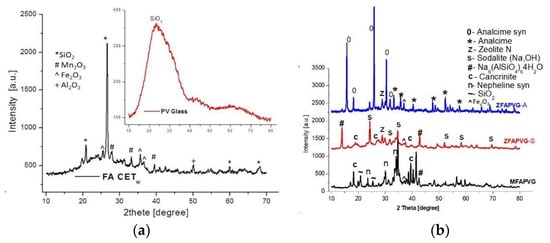 (a) FA CETw and PV glass diffractogram; (b) diffractogram of zeolites: MFAPVG by fusion method; ZFAPVG-A, ZFAPVG-S by fusion and hydrothermal treatment.