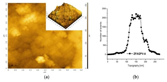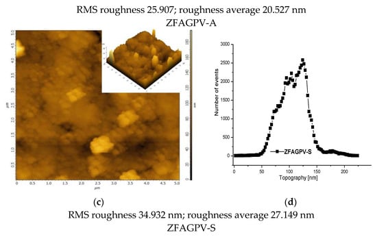 The morphological (SEM and AFM) and elemental (EDX) evaluations of the zeolite materials (ZFAGPV-A, ZFAGPV-S) show a relatively uniform and ordered nanoparticle dispersion. The presence of active energy sites indicates a favorable situation for adsorption application in heavy metals removal. This assumption is supported by other studies on FA surface modification, indicating the influence of hydrothermal processes or alkali treatment [,]. In the first steps, the adsorption occurs inside the larger micropores, and the distribution of the curve is moved to the smaller pores’ diameter values (see Figure 3), confirming the roughness values.