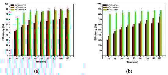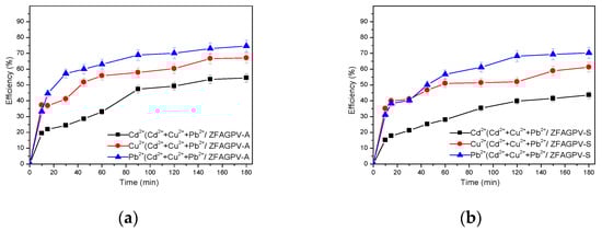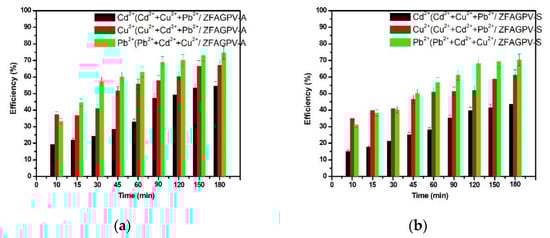 Heavy metals adsorption efficiency vs. contact time from three-cations solution: (a) ZFAGPV-A substrate and (b) ZFAGPV-S substrate.