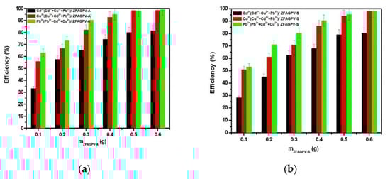 Heavy metals removal efficiency vs. mass of the substrate: (a) ZFAGPV-A and (b) ZFAGPV-S.