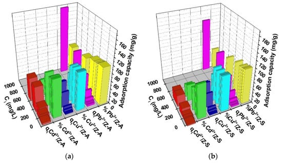 Figure 8a,b shows that when the initial concentration of heavy metals increases, the heavy metal removal from the aqueous solution will increase. This process is sustained by the gradient increase in concentration, which determines the adsorption driving force to increase as well []. It seems that when a solution with higher concentrations is employed, the time needed to attempt the adsorption equilibrium is significantly longer.