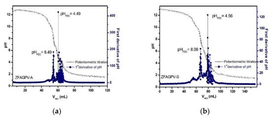 Adsorption is a surface process influenced by surface charges. The point of zero charges (PZC) is considered the value where the surface pH is neutral. The surface charge of the adsorbent is influenced by the solution pH and should be evaluated considering the PZC value(s). A positive substrate surface charge is obtained when the aqueous pH solution value is less than that of pHPZC. In this case, the sample adsorption properties for cadmium, copper, and lead ions decrease because of the competition between the heavy metals cations and H3O+. When the solution pH is higher than that of PZC, the sample surface is loaded with negative charges, and the adsorption capacity increases. The PZC for ZFAGPV-A and ZFAGPV-S substrates was evaluated based on the potentiometric titration method, and the results indicate two inflection points (Figure 9) that are related to the occurrence of surface multistep equilibrium processes. The previous study indicates that the working pH value inducing the highest heavy metal ions adsorption was pH = 7.0 for lead, 6.5 for copper, and 7.0 for cadmium. According to the Pourbaix diagram at pH 6.5–7.0, copper and cadmium cations can be present in aqueous solutions as Cu2+/Cu(OH)+ and Cd2+/Cd(OH)+ []. At pH = 7, lead is present in two ionic forms Pb2+/Pb(OH)+; thus, the precipitation of Pb2+ is negligible.