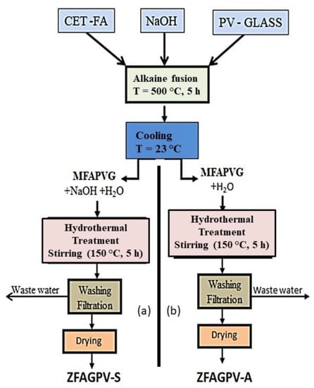 Details for the precursor alkaline fusion and hydrothermal treatment are provided in Scheme 1. The hydrothermal setup had the following parts: 500 mL reactor, vacuum pump, internal liquid circuit, and heating internal circuit. The samples were obtained within 5 h at 150 °C temperature and 5 atm pressure. The resulting zeolites were denoted ZFAGPV-S and ZFAGPV-A. The main difference between the two zeolites consists of the hydrothermal mixture composition: MAFPGV mixed with water and NaOH was used for ZFAGPV-S development, and MAFPGV mixed with water was employed for ZFAGPV-A formation.