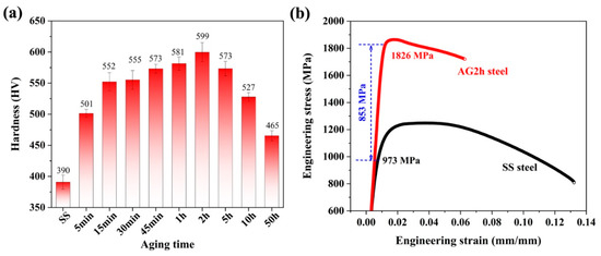 (a) Microhardness evolution of the steel aged at 500 °C for different periods. (b) Room-temperature tensile stress–strain curves for the SS and AG2h steels.