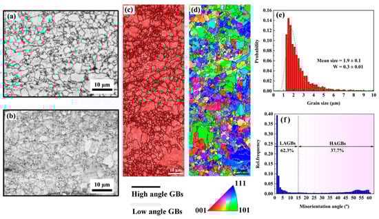 To further understand the effects of the matrix structure, optical microscopy, EBSD, and XRD measurements were carried out on the SS and AG2h steels. The SS steel exhibited a heterogeneous microstructure mainly composed of equiaxed and small grains. The microstructure of the AG2h steel (Figure 2b) is similar to that of the SS steel in terms of both grain morphology and grain size, indicating that the aging treatment has no apparent effect on the microstructure. In Figure 2c,d, most of the body-centered cubic (BCC) structure grains are separated by low-angle grain boundaries (GBs), which are then grouped into martensitic blocks, while only a small portion of equiaxed ferritic grains distribute around the martensite phase. The grain size distribution of the SS steel is presented in Figure 2d, showing that the mean grain size is 1.9 ± 0.1 μm with log-normal function fitting. Notably, the proportion of low-angle GBs (62.3%) in Figure 2f is much more than the high-angle GBs, which are also found in 1.5 wt.% Mn-doped steels, confirming that low-angle GBs evolve from the dislocation walls during the hot-rolled process [].