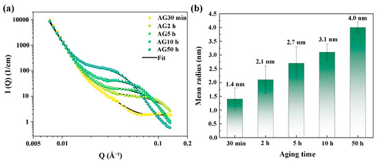 (a) SANS-intensity distribution as a function of momentum transfer Q for the steels aged at 500 °C for various times and (b) the mean radius of nanoparticles.