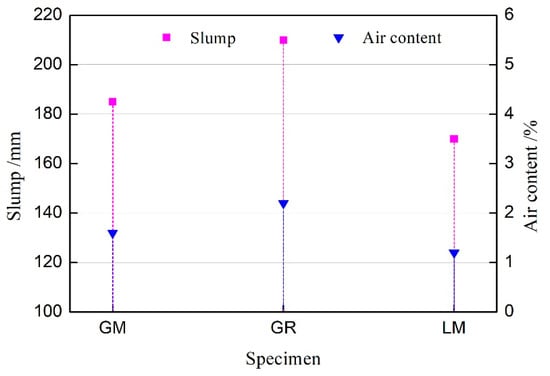 The working performance of the concrete prepared for the tests is shown in Figure 1. The flowability tests on the three groups of concrete show that slight bleeding occurs in the GM mixture group, the flowability and viscosity of the GR mixture group are satisfactory, and the LM mixture group is sticky and has poor mobility. The result shows a high positive correlation between the slump constant and air content in the concrete mixture. When the amount of water reducer is the same, the slump of the concrete prepared using natural sand is up to 210 mm, and the air content is 2.2%, while the slump of the concrete prepared using the manufactured sand is 185 mm and 170 mm, and the air content is 1.6% and 1.2%.