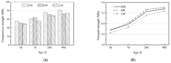 Figure 2 displays the results of the compressive strength and bending strength of concrete. With increasing age, the compressive strength and flexural strength of concrete prepared with manufactured sand and natural sand, respectively, increase gradually, and the rate of the strength increase appears rapidly at first, and slows after the curing age of 28 days. The compressive strength of the GM group is the highest, the GR group is second best, and the GM group is the lowest. Comparing the experimental results between the GM and GR groups shows that the compressive strength of concrete prepared using manufactured sand is higher than concrete prepared using natural sand. The compressive strength of GM was 7.8% higher than that of GR when the curing age is 5 d. At 90 d, the compressive strength of GM was 14.6% higher than that of GR.