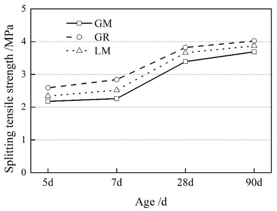 The splitting tensile strength of concrete prepared using low carbon aggregate is shown in Figure 3. The specimens in the GR group show higher split tensile strength. On the contrary, the specimens in the GM group have the lowest split tensile strength. Manufactured sand reduced the tensile strength of the concrete. Compared to the specimens in the GR group, the tensile strength of the specimens in the GM group decreased by 15.8% and 20.4% from 5 d to 7 d. With the increase of the curing age, the tensile strength difference between the GM and GR group specimens gradually decreased.