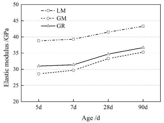 The elastic modulus of concrete prepared with manufactured sand and with natural sand is shown in Figure 4. Comparing the elastic modulus of the GR and GM groups shows that manufactured sand will reduce the elastic modulus of concrete, but the reduction is limited. With the increase of the curing age, the elastic modulus of the specimens in the two groups is roughly the same. It is worth noting that the elastic modulus of concrete prepared with granite aggregate is significantly lower than that with limestone aggregate. The elastic modulus of specimens in the GM group is 26.3% lower than those in the LM group concrete at 5 d. With the increase of the curing age, this gap did not decrease. Because the granite aggregate used in this experiment has a low elastic modulus, and coarse aggregates have a vital influence on the elastic modulus of concrete, the use of aggregates with low elastic modulus directly leads to concrete with a lower elastic modulus.