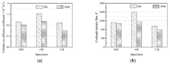 As shown in Figure 5, the ability to resist chloride ion penetration in concrete prepared with manufactured sand and with natural sand at 28 d and 180 d was characterized by the RCM method and the electric flux method. The ability to resist chloride ion penetration in specimens in the GM group, whose specimens were prepared with manufactured sand, is better than those in the GR group prepared with natural sand, especially at the age of 28 days when the improvement effect is more obvious. This is because the manufactured sand contains a certain amount of stone powder, which can fill the pores in the matrix, refine the pore structure of the concrete matrix, increase the density of the matrix, and reduce the intrusion of chloride ions. Comparing the results of the GR and GM group shows that the ability to resist chloride ion penetration in the concrete made of granite and limestone were basically the same. The electric flux is less than 1200 C, and the chloride ion diffusion coefficient is less than 1.0 × 10−12 m2/s.