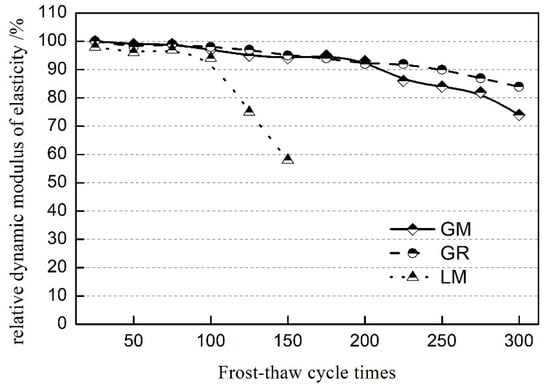 The frost resistance of concrete with different aggregates is shown in Figure 6. With increasing the freeze–thaw cycle times, the relative dynamic modulus of elasticity of all the concrete samples decreases gradually. The relative dynamic modulus of elasticity of the LM sample drops to 58% after 150 times, indicating that the LM sample has poor frost resistance. However, the GM and GR specimens show a higher relative dynamic modulus of elasticity after 300 times. The results indicate that granitic manufactured sand could produce concrete with excellent frost resistance, which means that the frost resistance of concrete has little connection to the type of fine aggregate.