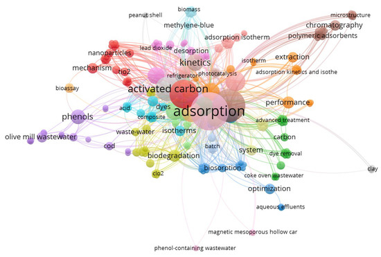 The bibliometric technique for analysis is suggested as a significant method and is applied commonly for a selected topic analysis on appropriate research literature. The bibliometric analysis tool can be used for linking key features of a specific topic. Hence, the attained bibliometric mapping categorizes the most research papers cited in a particular field in the literature. Moreover, it investigates the associated link concerning the terms accomplished. Thus, an investigation conducted using the database of the “Web of Science” utilising the keywords of “Phenol wastewater AND Treatment AND Adsorption” was performed and 1122 published articles found, in scientific research journals from the year 2000 to May of 2022. Figure 1 displays a profile of the current research work associated to the aqueous effluent comprising organic phenol adsorption over various and numerous adsorbent materials. The upsurge in the number of published articles might help in further improvement of wastewater treatment via the low-cost adsorption technique, which helps achieve a win–win sustainable environment. Further, the keywords occurrence was analyzed via “VOSviewer software” that is used to analyze the articles in such research work (version 1.6.16.0, accessed on 9 May 2022). The bibliometric network mapping produced in VOSviewer, based on 1122 articles from the examination terms, was explored in cluster plots of Figure 1. The clusters signify hotspots. In the displayed map, extensive notice can be paid to the adsorption using activated carbon, which was intensively identified among the other adsorbent materials introduced. Not only is adsorption a sustainable technique for its accessibility and no energy needs, but also the application of low-cost waste materials as adsorbents, which are recommended for a sustainable environment. Despite the availability of waste materials in every site in the whole world, up until now, the practical real treatments for adsorption using waste materials for industrial applications currently remain limited.