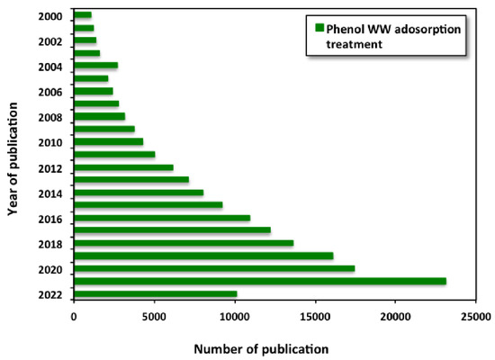 Further extra data analysis was carried out to explore the growth of research focusing on phenol wastewater treatment/adsorption systems. It is noticed that there is increase in the research published through the last two decades (from 2000 to 2022), as stated in Figure 2. Hence, such studies offer the opportunity for the use of various adsorbent materials for wastewater embedded with phenol as an opportunity for further use of reclaimed water.