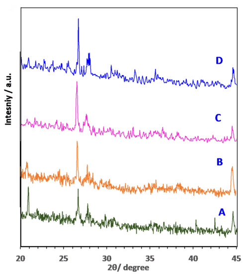 XRD diffraction pattern of AS adsorbent substances: (A) AS; (B) AS400; (C) AS600 and (D) AS800.