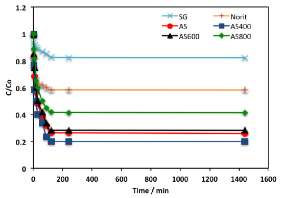 Initially, to design the adsorption system, it is essential to explore the time of adsorption equilibrium. The time outline of organic effluent adsorption using AS adsorbents (AS, AS400, AS600, AS800), in addition to the two common commercial adsorbent materials (activated carbon called Norit and silica gel called Sgel) for comparison was investigated at room temperature and displayed in Figure 6. To absolutely attain the equilibrium time, up to 24 h time was applied for each adsorbent. The results revealed that, overall, AS400 displayed the highest phenol adsorption capacity, with the majority of the phenol adsorbed through the first 2 h. To add up the required time to achieve equilibrium for all the adsorbents was 2 h. Both Norit and SG showed the lowest phenol uptake. However, AS adsorbents, AS400, showed the maximum phenol removal. An explanation may be associated with the surface area and pore size distribution [32]. Thus, the presence of the ZSM-12 in the thermally treated sludge shows its significance in enhancing the adsorption capacity. Zeolite (ZSM-12) seems to be a cation exchanger because of the negative charge of its outline. Hence, ZSM-12 attached and bounded to the water molecules and then the phenol molecules are adsorbed. Other related studies also confirmed the importance of zeolite in wastewater treatment [33,34,35].