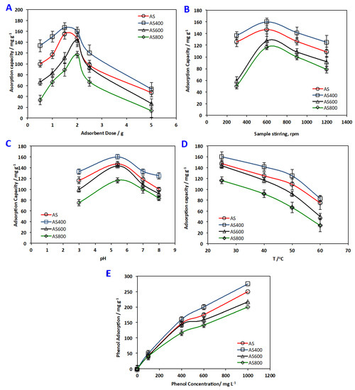 The temperature effect on the AS adsorbent/phenol sorption system was studied at four different temperatures, i.e., 25 °C, 40 °C, 50 °C and 60 °C (Figure 4D). For all the AS adsorbent materials used, phenol uptake decreased by increasing temperature, indicating the AS adsorbent materials/phenol sorption system was apparently exothermic. AS400, which had the highest adsorption trend, showed a decrease in the adsorption capacity from 160 to 83 mg g−1 by temperature increase from 25 to 60°C, respectively. Such results could be associated with the temperature increase, leading to weakening of the attractive forces of adsorption between the AS materials surface and the phenol molecules. The result is a decline in the overall adsorption process. Such an investigation was recorded previously by scattered researchers [43,44]